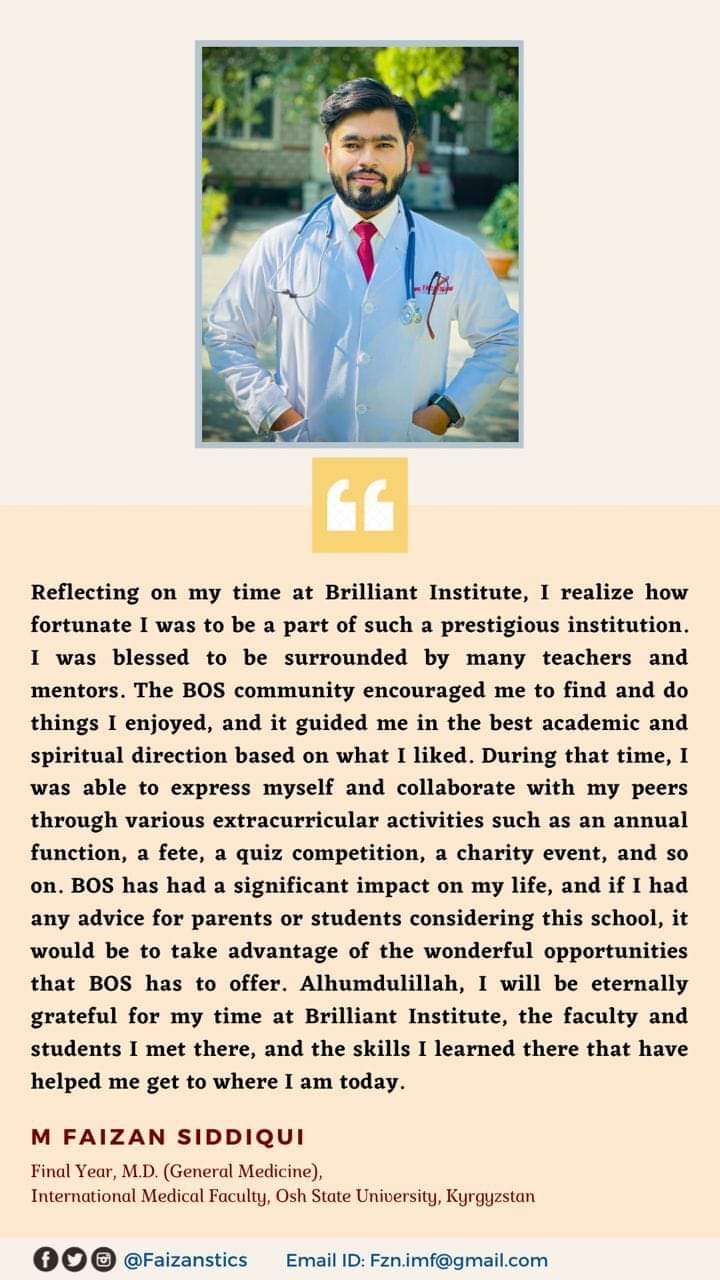 “Reflecting on my time at Brilliant Institute, I realize how fortunate I was to be a part of such a prestigious institution. I was blessed to be surrounded by many teachers and mentors. The BOS community encouraged me to find and do things I enjoyed, and it guided me in the best academic and spiritual direction based on what I liked. During that time, I was able to express myself and collaborate with my peers through various extracurricular activities such as an annual function, a fete, a quiz competition, a charity event, and so on. BOS has had a significant impact on my life, and if I had any advice for parents or students considering this school, it would be to take advantage of the wonderful opportunities that BOS has to offer. Alhumdulillah, I will be eternally grateful for my time at Brilliant Institute, the faculty and students I met there, and the skills I learned there that have helped me get to where I am today.