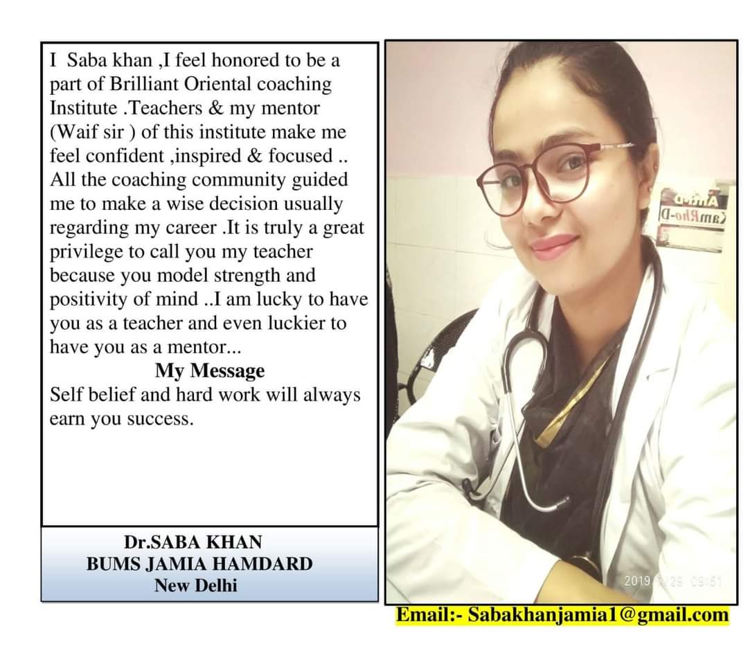 I Saba khan, I feel honoured to be a part of Brilliant Oriental coaching Institute. Teachers & my mentor (Waif sir ) of this institute made me feel confident inspired & focused. The coaching community guided me to make wise decisions usually regarding my career. It is truly a great privilege to call you my teacher because you model strength and positivity of mind. I am lucky to have you as a teacher and even luckier to have you as a mentor… My Message Self-belief and hard work will always earn you success.